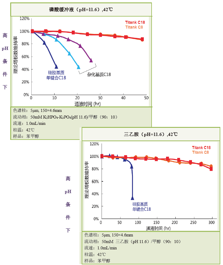 從以上兩組數(shù)據(jù)可以發(fā)現(xiàn),在強堿或高溫等苛刻條件下的 Titank C18/C8 的色譜柱壽命,都遠(yuǎn)在市售高耐堿性柱和普通硅膠基質(zhì)ODS柱之上。