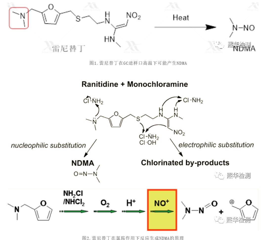 值得注意的是,有報道稱雷尼替丁在使用HS-GC-MS/MS方法檢測的時候,會出現假陽性結果。有研究表明,該結果是因為部分雷尼替丁樣品在GC進樣口的高溫環境下降解產生NDMA導致(圖1)。也許是冥冥之中早有定數,雷尼替丁作為一個普通的組胺H2受體阻斷劑,早在2012年【1】和2014年【2】就被當作模型化合物用于研究三級胺的亞硝酸化反應(圖2)。上述文獻顯示,雷尼替丁在氧化劑的作用下(NH2Cl,注意不是氯化銨,該化合物是一種消毒劑)作用下,能夠通過一系列復雜的分子內反應生成NDMA。