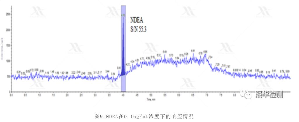 如上所述,三重四極桿質譜對NDMA的檢測能力令人滿意,我們相信類似的方法對于NDEA的檢測效果會更佳。因為NDEA的分子量為102,受低分子量區雜質的干擾更小,理論上應該有更好的靈敏度。如圖9所示,在0.1ng/mL濃度下,NDEA的信噪比達到55,證實了上述推測。