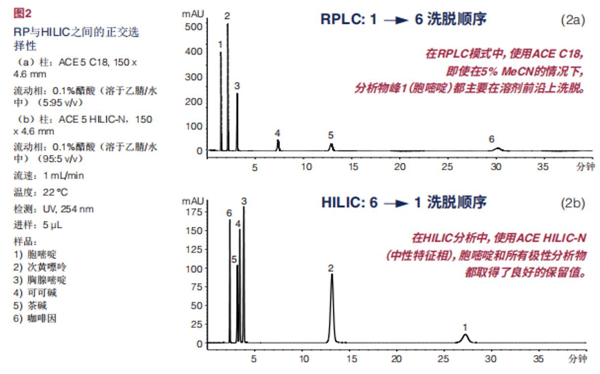 比較直觀的表現(xiàn)兩者的不同,疏水化合物在反相C18上的保留順序與Hilic模式下剛好相反。