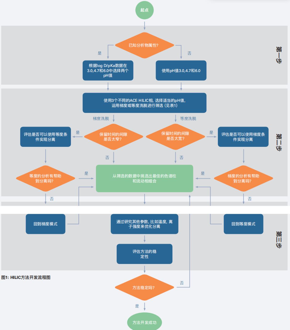 A:結(jié)合大極性分析物和Hliic色譜柱的特點,我們建立了一套可行的方法開發(fā)流程,可供大家參考。