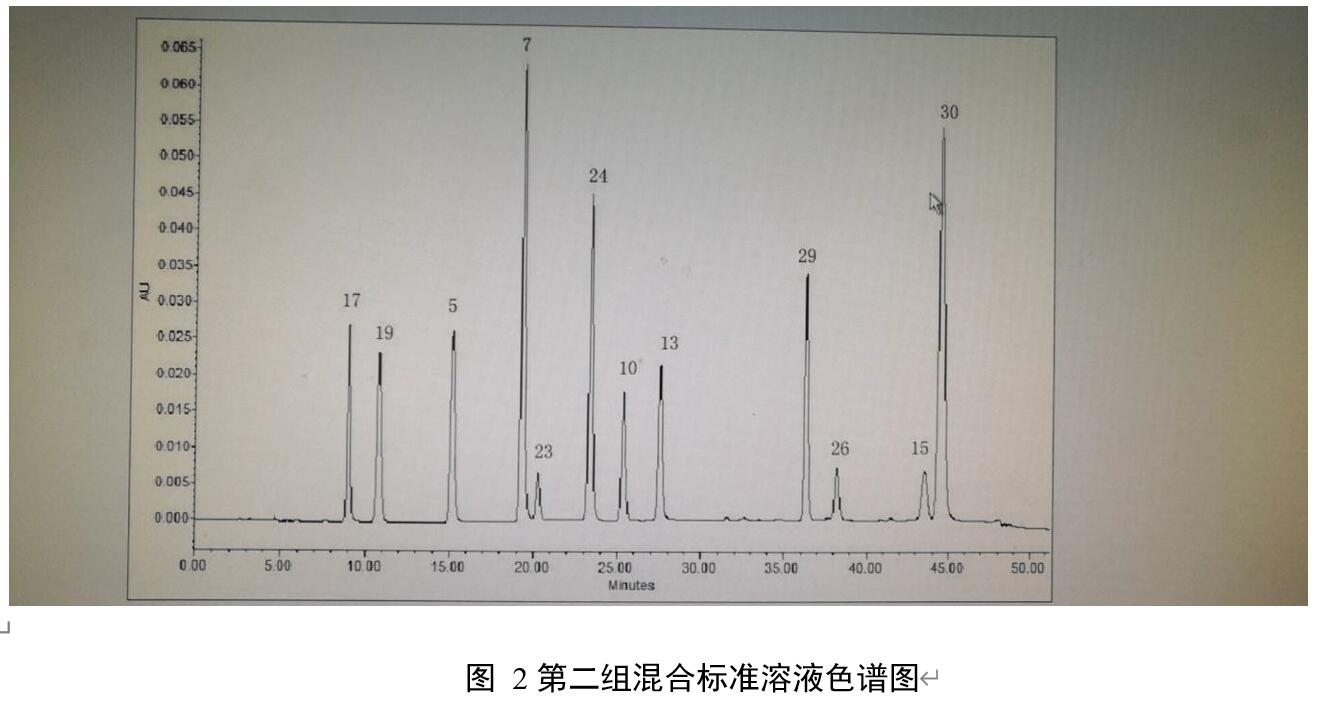 17:間苯二胺;19:氫醌;5:鄰苯二胺;7:鄰氨基苯酚;23:對(duì)甲基氨基苯酚硫酸鹽;24:4-硝基鄰苯二胺;10:甲苯-3,4- 二胺;13:6-氨基間甲酚;29:2,7-萘二酚;26:N,N-二乙基對(duì)苯二胺硫酸鹽;15:N,N-二乙基甲苯-2,5-二胺鹽酸鹽;30:N- 苯基對(duì)苯二胺