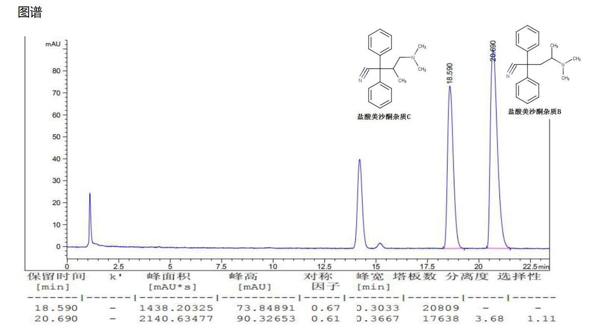 方法說明:鹽酸美沙酮雜質(zhì) B、C 在結(jié)構(gòu)上屬于同分異構(gòu)體,酸性條件下拖尾嚴(yán)重且無法分離,使用耐堿性的 Titank C18,在堿性條件下可以將兩者分離,且峰型良好。