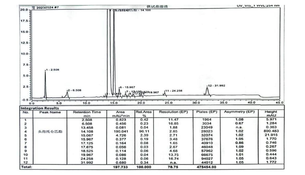 相比其它品牌色譜柱,該柱子有效解決了主峰相鄰雜質(zhì)的分離度,其他色譜柱分離度未達 1.0,菲羅門色譜柱可達到 1.5 以上;重現(xiàn)性較好,多次進樣均能重現(xiàn),保留時間較為穩(wěn)定;柱效較高,主成分峰理論板數(shù)可達到 20000 以上。