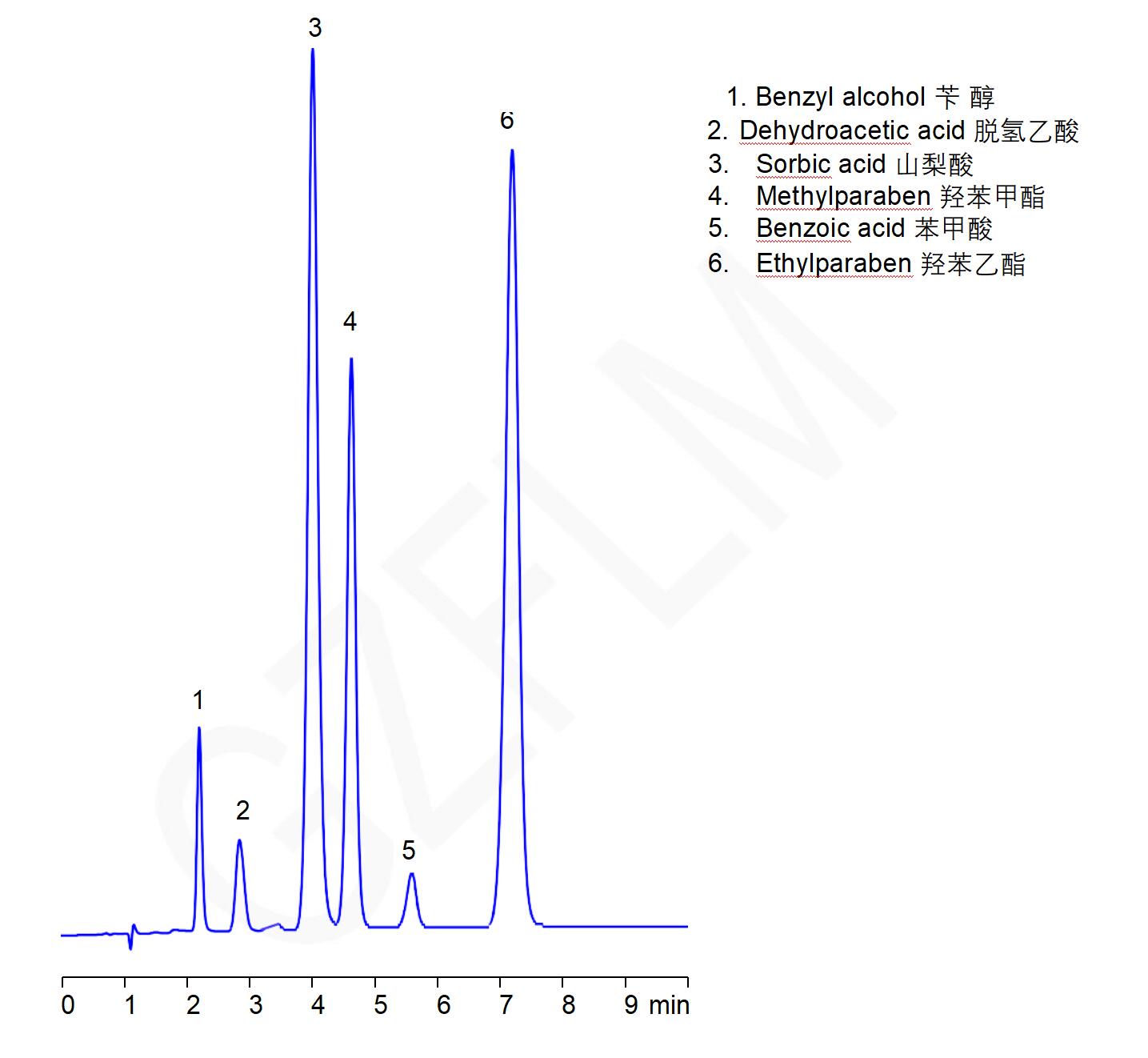 App ID: FLM-C230020 Comixsil HAX分析脫氫乙酸苯甲酸芐醇山梨酸羥苯甲酯等6種性質(zhì)不同的防腐劑 1. Benzyl alcohol 芐 醇 2. Dehydroacetic acid 脫氫乙酸 3.Sorbic acid 山梨酸 4.Methylparaben 羥苯甲酯 5.Benzoic acid 苯甲酸 6.Ethylparaben 羥苯乙酯 Column:Comixsil HAX 3u 100*3.0mm (P/N:FMD-HAX3-YONU) Mobile phase: 乙腈:水:150mM 磷酸二氫銨 (pH 3.7) = 15:65:20 Flow rate: 0.6 ml/min Detection: 235 nm ![]() |