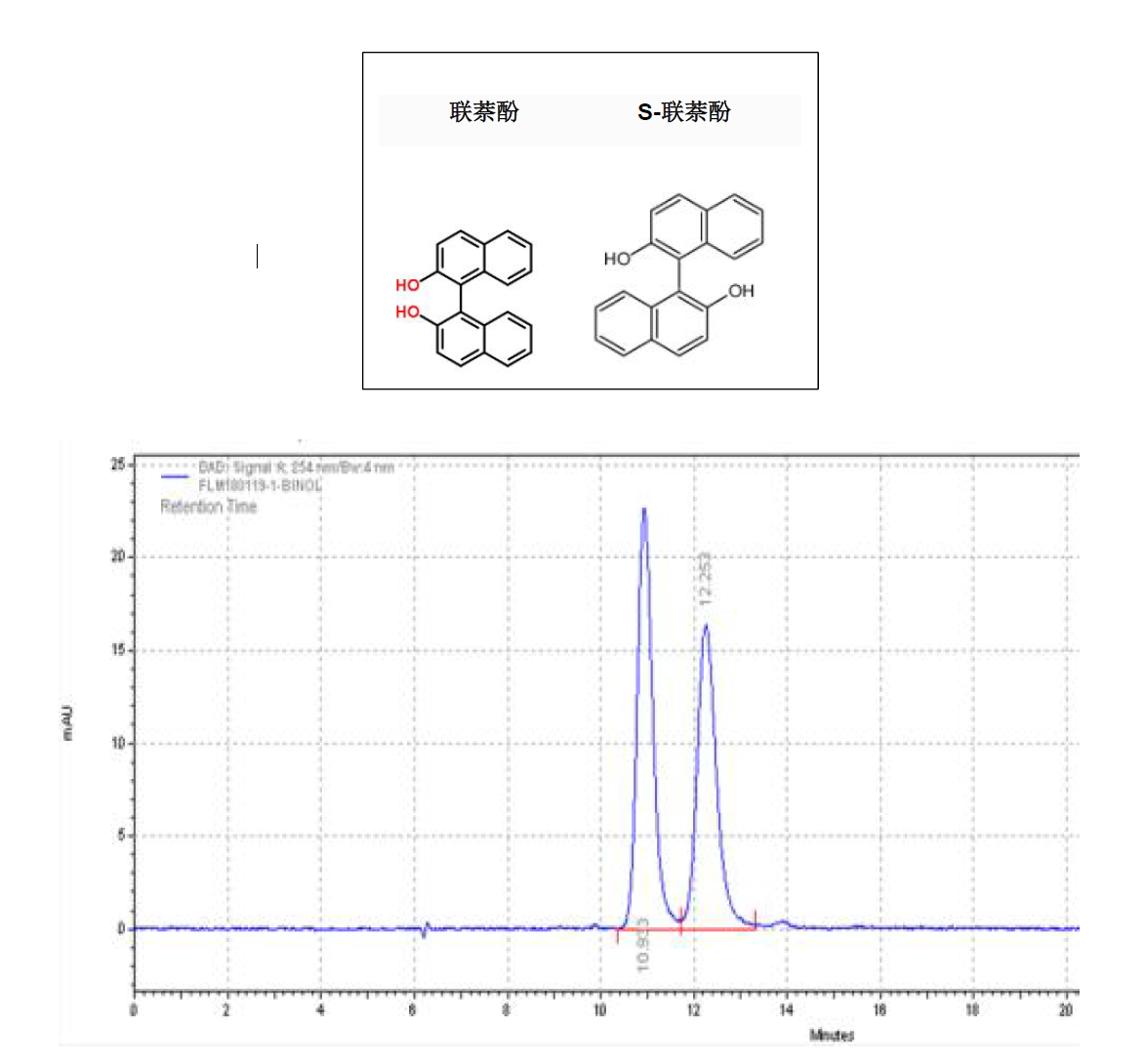 App ID: FLM-B250006 聯萘酚與S-聯萘酚的分離 色譜柱:Chiral INC 250*4.6mm,5um (貨號:FMG-JY5-I03) 流速:0.5 mL/min 檢測:波長254nm, 柱溫:25°C 樣品濃度:N/A 進樣量:1μ 溶劑:水:甲醇=40:60(V:V) 流動相:咨詢銷售