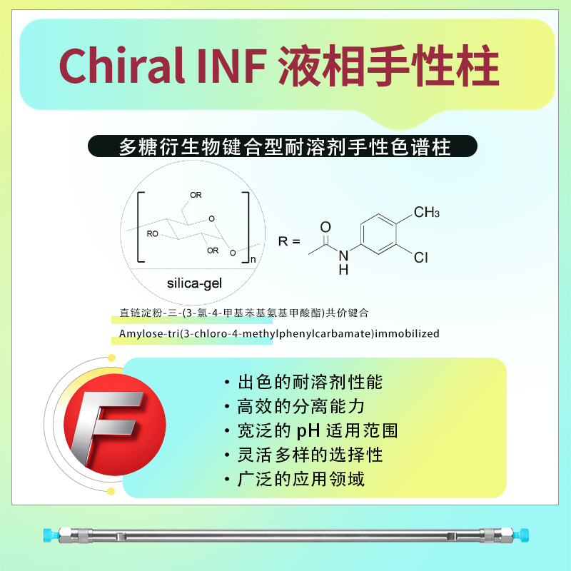Chiral INF 鍵合型耐溶劑手性柱的固定相為直鏈淀粉-三-(3-氯-4-甲基苯基氨基甲酸酯)共價(jià)鍵合,Amylose-tri(3-chloro-4-methylphenyl 二、使用條件 壓力:為了延長手性柱的使用壽命,建議保持壓力在30MPa以下。這有助于減少色譜柱的磨損和性能下降。 pH值:該手性柱適用于pH值范圍在2.0至9.0之間的溶液。這提供了廣泛的適用性,適用于多種實(shí)驗(yàn)條件。 溫度:建議在0℃至40℃的溫度范圍內(nèi)使用,以確保色譜柱的穩(wěn)定性和分離效果。 三、可使用的溶劑 Chiral INF 鍵合型耐溶劑手性柱可使用多種溶劑,包括: 正相溶劑:如n-Hexane(正己烷)、IPA(異丙醇)、EtOH(乙醇)等。 特殊流動(dòng)相:如Ethyl acetate(乙酸乙酯)、CH3Cl(氯仿)、THF(四氫呋喃)、MTBE(甲基叔丁基醚)等。 反相溶劑:如H2O(水)、IPA(異丙醇)、MeOH(甲醇)等。 這種廣泛的溶劑適應(yīng)性使得該手性柱在實(shí)驗(yàn)和分析中具有更高的靈活性和適用范圍。 四、產(chǎn)品規(guī)格與訂貨信息 Chiral INF 鍵合型耐溶劑手性柱具有多種規(guī)格,以滿足不同實(shí)驗(yàn)和分析需求。常見的規(guī)格包括不同粒徑(如5μm、3μm等)、不同長度(如250mm、150mm等)和不同內(nèi)徑(如4.6mm、2.0mm等)的色譜柱。具體訂貨信息: